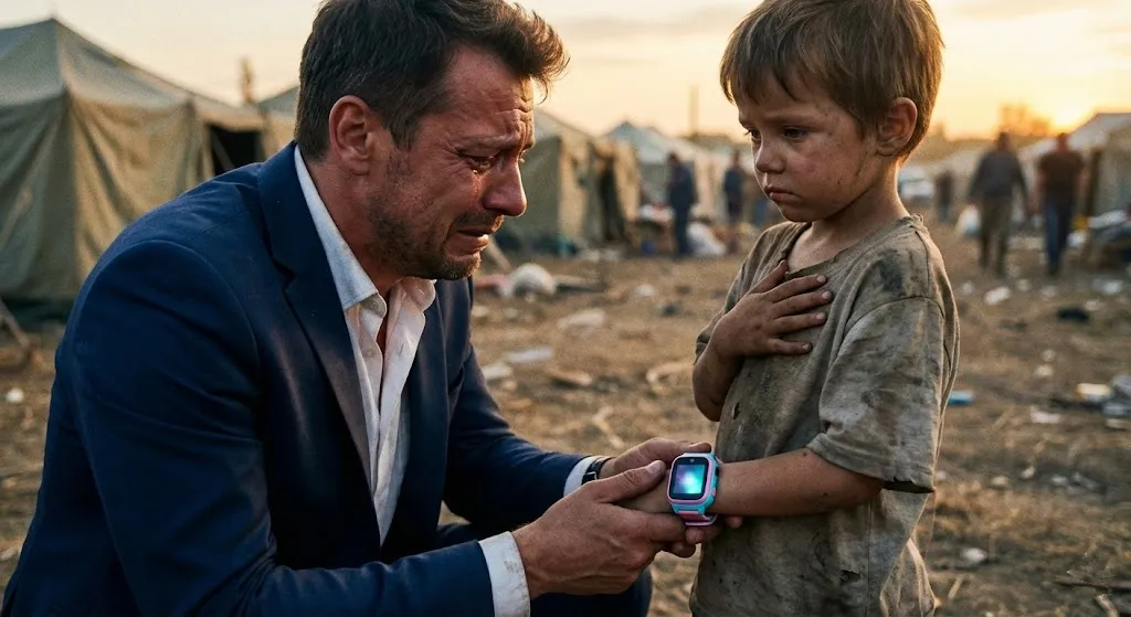 Мальчик лет девяти. Босой, грязный. Худой, в рваной одежде. Глубокие глаза того, кто знает голод. На его левом запястье — детские часы. Поцарапанные, выцветшие, играющие колыбельную Миши.