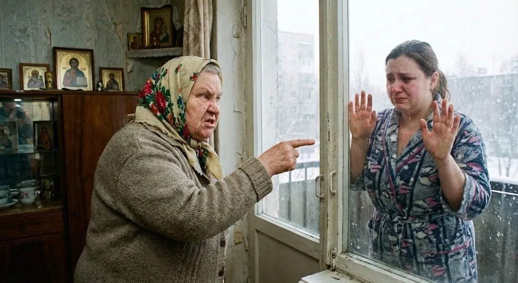 Оксана была в тонкой трикотажной кофте и лёгких брюках, на ногах — домашние тапочки. Но свекровь уже выталкивала её на балкон, не слушая мольбы.