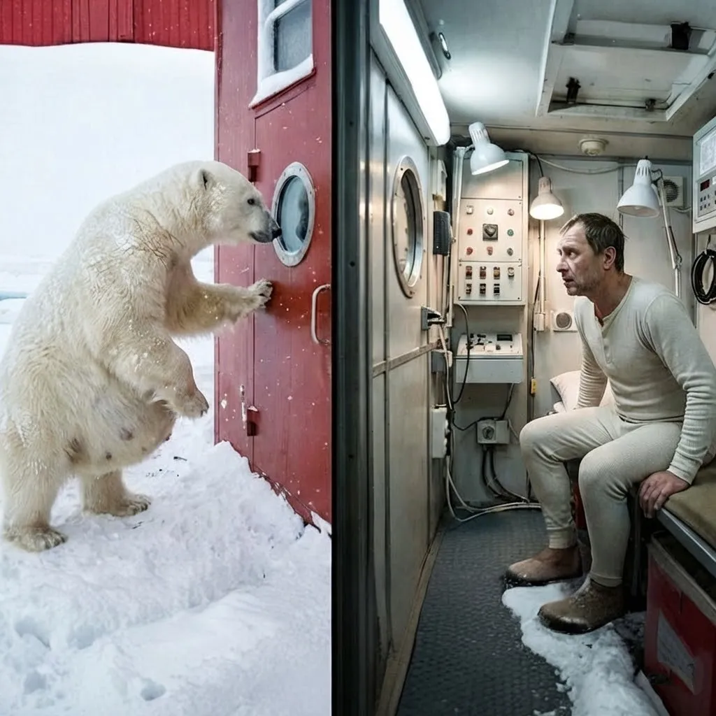 Её массивная голова была опущена, а дыхание вырывалось тяжёлыми клубами пара в морозном воздухе. За 20 лет работы на полярных станциях я видел сотни медведей, но никогда ещё они не подходили так близко к жилым модулям, и уж точно никогда не стояли у самой двери, словно ожидая, что их впустят. Медведица подняла голову, её чёрные глаза встретились с моими, и в этом взгляде я увидел что-то совершенно невероятное.